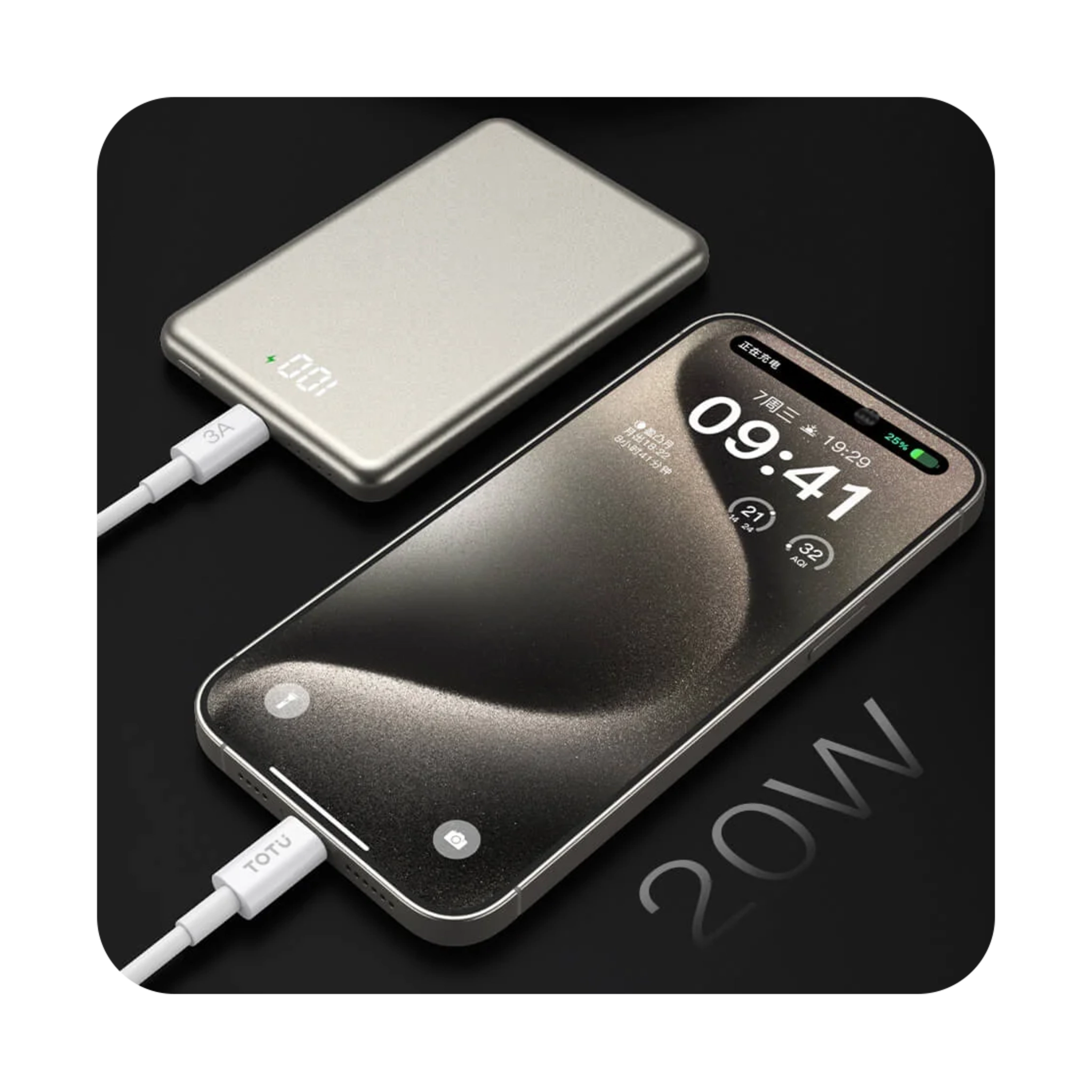 یکی از ویژگیهای برجسته پاوربانک Totu، امکان شارژ همزمان دو دستگاه است. شما میتوانید یک دستگاه را به صورت بیسیم و دیگری را از طریق پورت USB-C شارژ کنید. این ویژگی برای کاربران پرمشغلهای که نیاز به شارژ چند دستگاه دارند، بسیار کاربردی است.